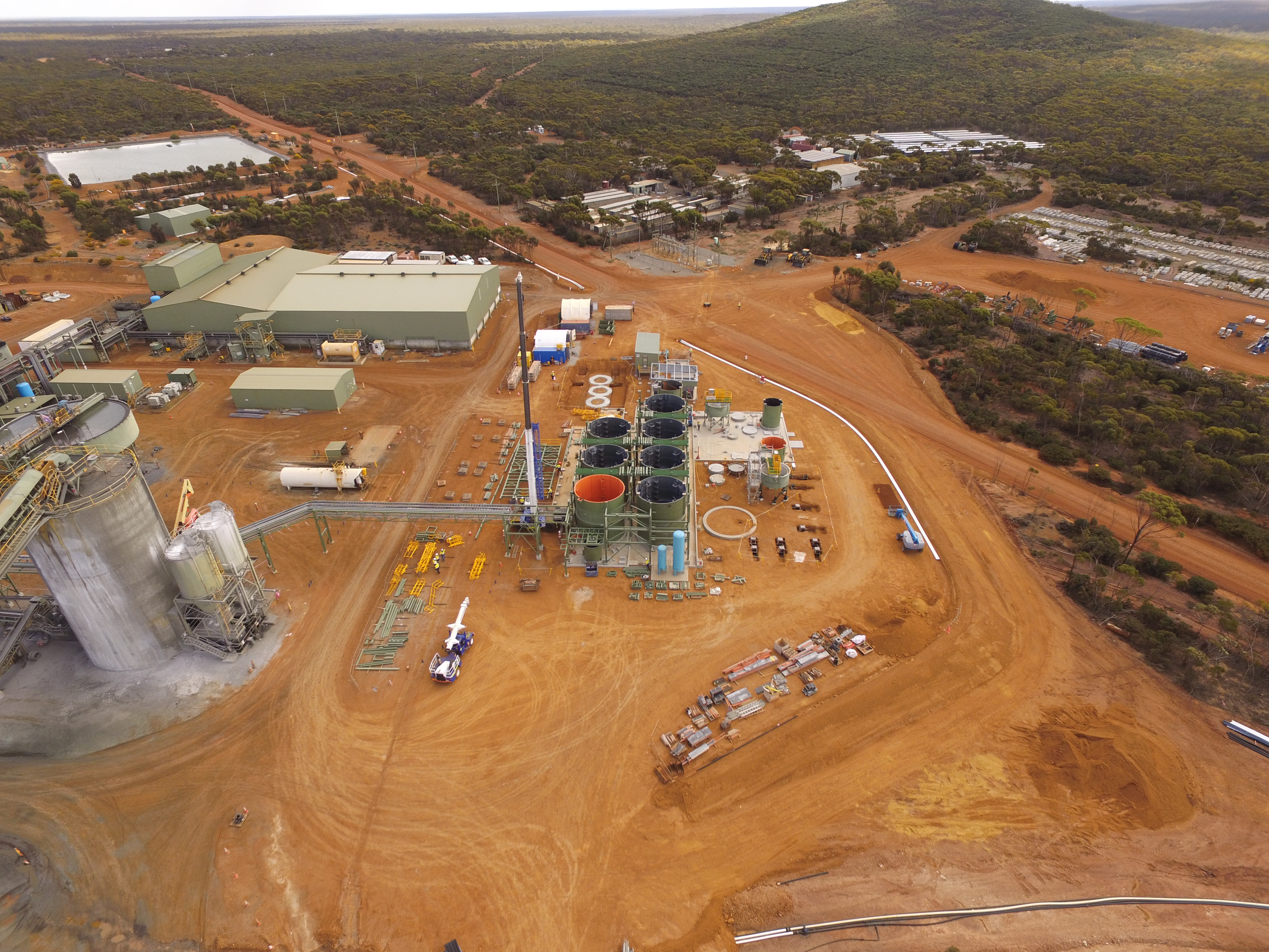 The scope covered the detail design, supply and construction of the processing plant to facilitate a unique Bioleach process at Cosmic Boy. This process has been patented by Western Areas Limited (WSA) and has potential applications for many operations around the world that experience similar problems with arsenic and sulphide ores. The interesting features of the bacteria are that they can survive temperatures above 90 deg C whilst living in an acidic and hypersaline environment. Very high corrosion rates of materials (even duplex stainless steels) have been observed by WSA while operating their pilot plant. Many of the process vessels are constructed from plastic or fibreglass impregnated with silicon carbide for wear. A lot of the equipment immersed in slurry is fabricated from grade 2 Titanium and lined with Butyl rubber.